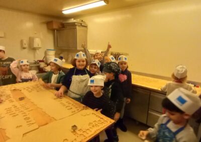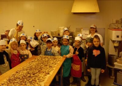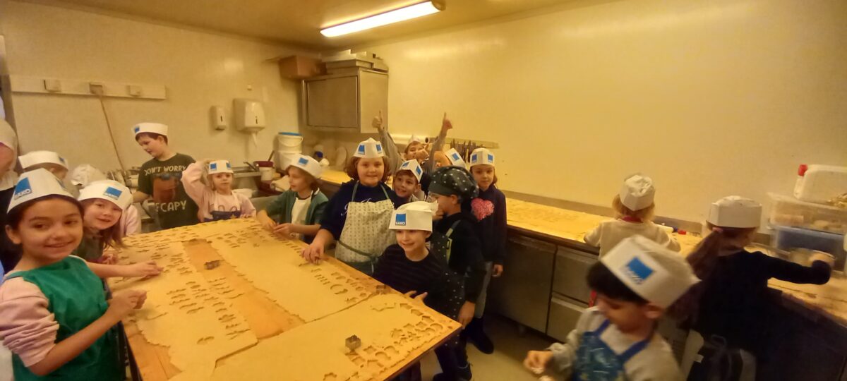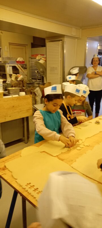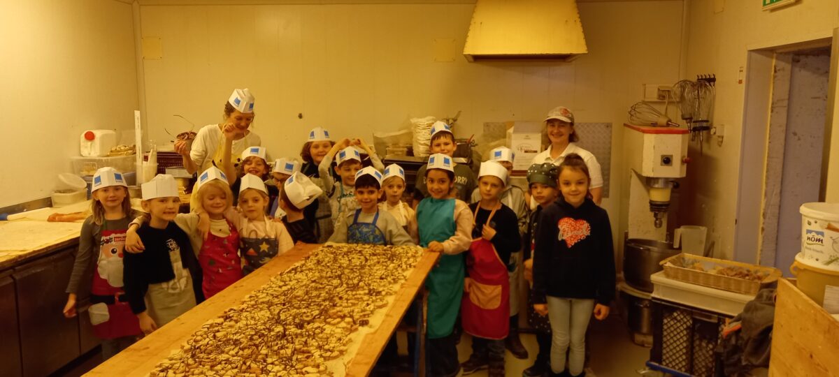 Frau Schmuck, die Chefin, hatte köstlichen Teig vorbereitet und die Kinder der Klasse stachen viele Kekse aus, klebten sie nach dem Backen mit Marmelade zusammen und am Ende durften wir sie mit viel Schokolade verzieren. Außerdem zeigte uns die Chefin noch die riesige Semmelbackmaschine.